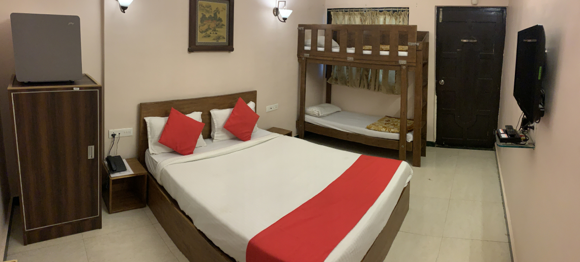 Our Cottage Rooms are ideal for a family having up to 4 persons (adults + kids). The room has an attached bathroom, private balcony with a sit-out, one double bed, one bunk bed, intercom facility,a mini cooler / fridge, a wardrobe and a 32 inch LED TV with DTH connection. The approximate size of this category of room is 250 sq ft.Air-conditioning (a/c) is available for this room category and is chargeable extra. The payment for the air-conditioning facility is to be made at the time of check-in at the reception.