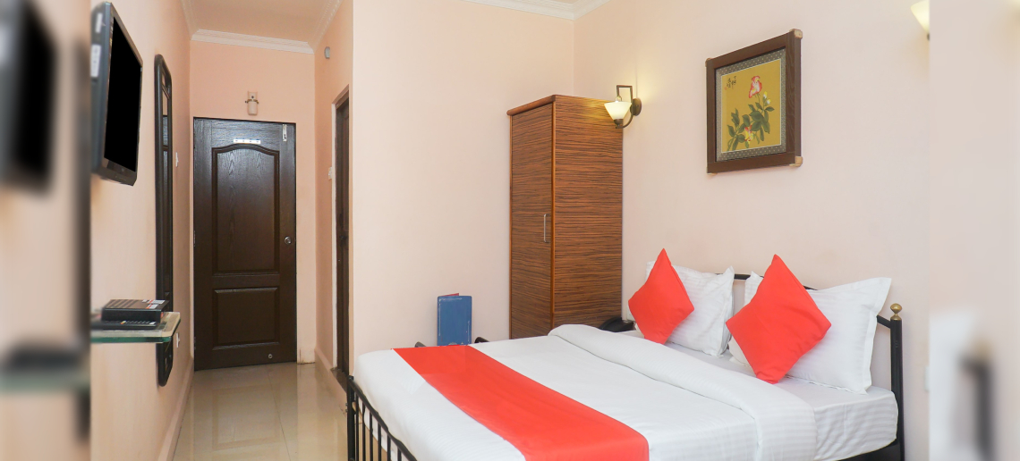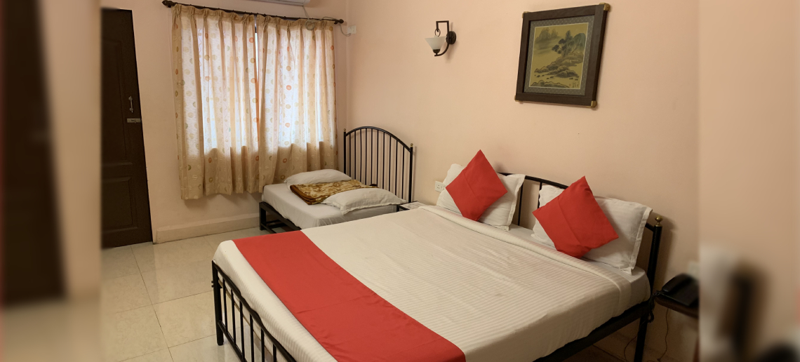 Our Deluxe Rooms can accommodate a maximum of 3 persons (adults + kids). The room has an attached bathroom, private balcony with a sit-out, one double bed, one sofa-cum bed, intercom facility,a minicooler / fridge, a wardrobe and a 24 inch LED TV with DTH connection. The approximate size of this category of room is 210 sq ft.Air-conditioning (a/c) is available for this room category and is chargeable extra. The payment for the air-conditioning facility is to be made at the time of check-in at the reception.