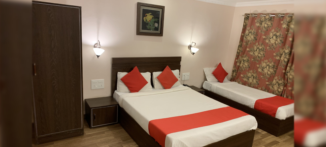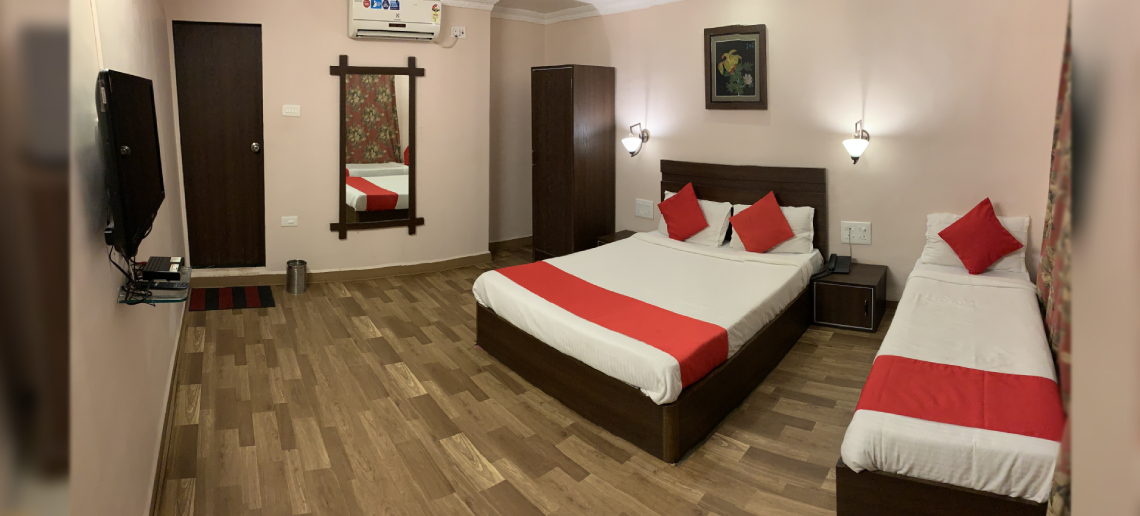 Our Super Deluxe Rooms can accommodate a maximum of 3 persons (adults + kids). The room has an attached bathroom, private balcony with a sit-out, one double bed, one single bed, intercom facility,a minicooler / fridge, a wardrobe and a 32 inch LED TV with DTH connection. The approximate size of this category of room is 250 sq ft.Air-conditioning (a/c) is available for this room category and is chargeable extra. The payment for the air-conditioning facility is to be made at the time of check-in at the reception.